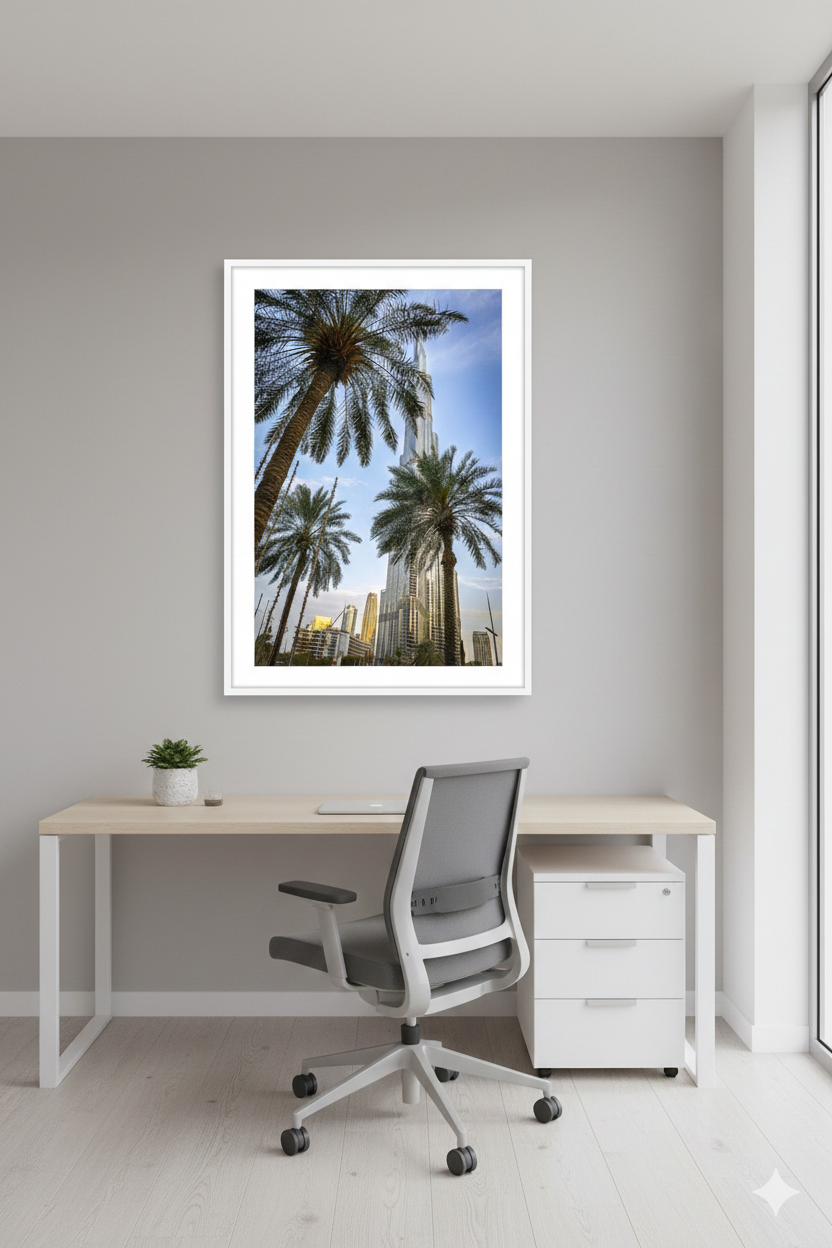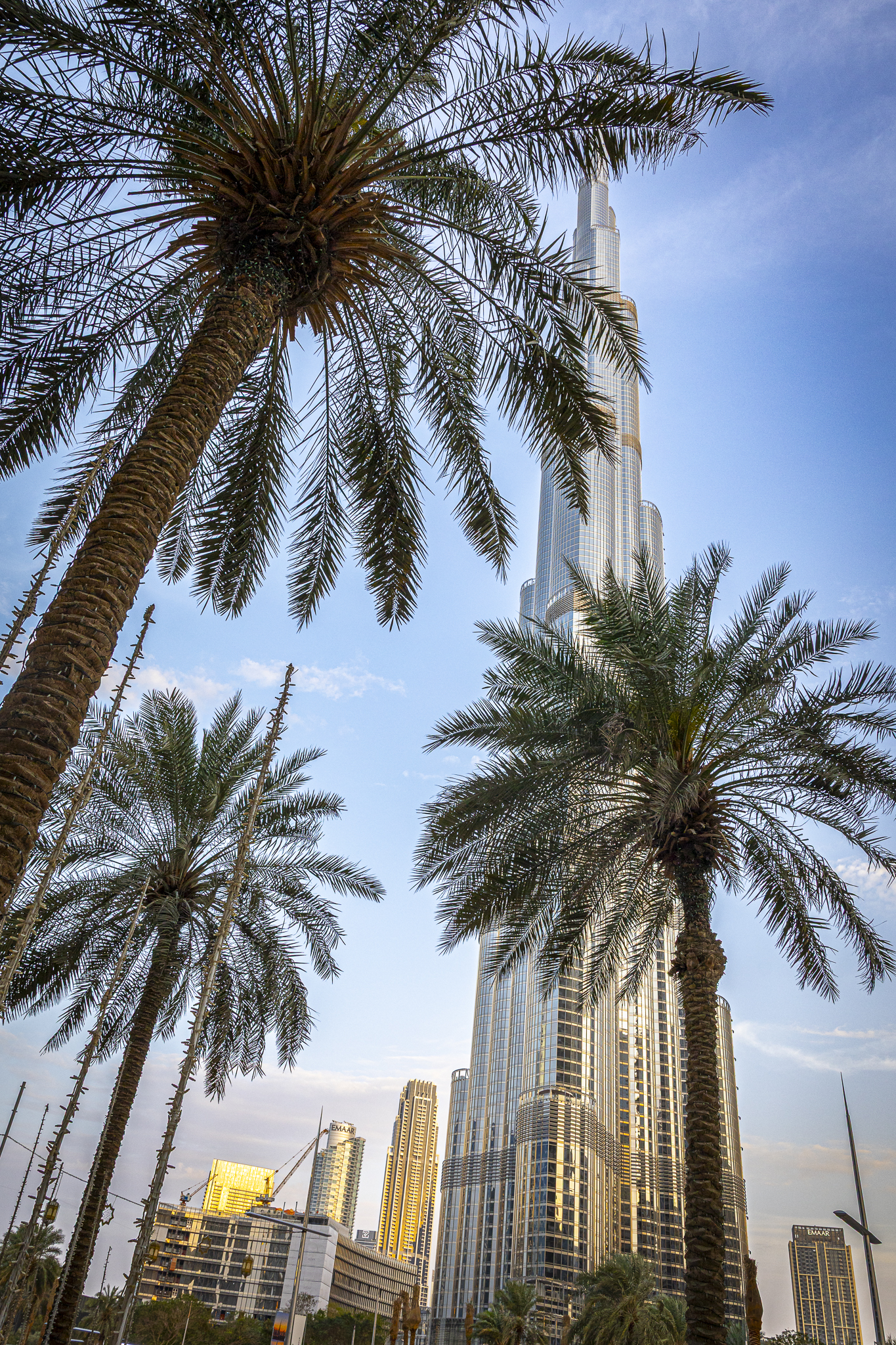 Palm fronds frame the Burj Khalifa, softening the geometry of the world’s tallest structure